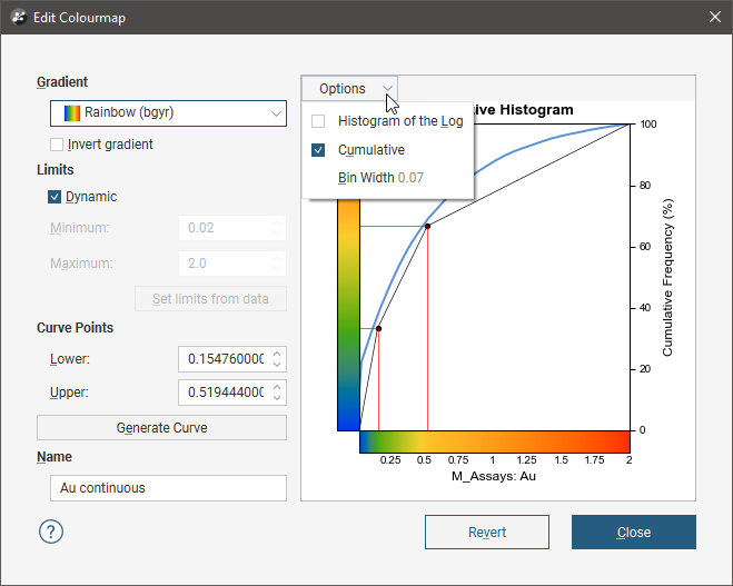If the Dynamic option is enabled, the gradient will be updated when the data is updated, such as when drilling data is appended. If the option is disabled, the values manually set for the Minimum and Maximum limits will control the lower and upper bounds of the colourmap. Reducing the range of the upper and lower bounds is useful if the bulk of the data points have values in a range much smaller than the overall range of the data. This is common in skewed data.