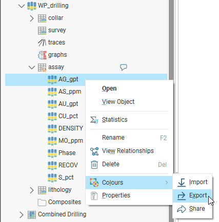 To export a local colourmap, expand the data object in the project tree. Right-click on the column whose colourmap you wish to export and select Colours > Export.