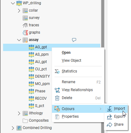 To import a local colourmap for use with a single object in the project, expand that object in the project tree. Right-click on the column you wish to use the colourmap on and select Colours > Import.