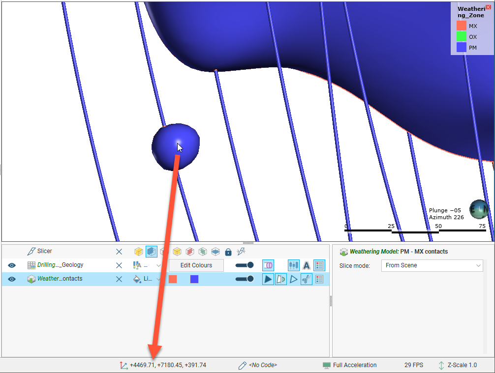 The simplest way of measuring an approximate location in the scene is to first display an object in the scene window, then position the cursor over the location. The position of the cursor is displayed at the bottom of the Leapfrog Works window: