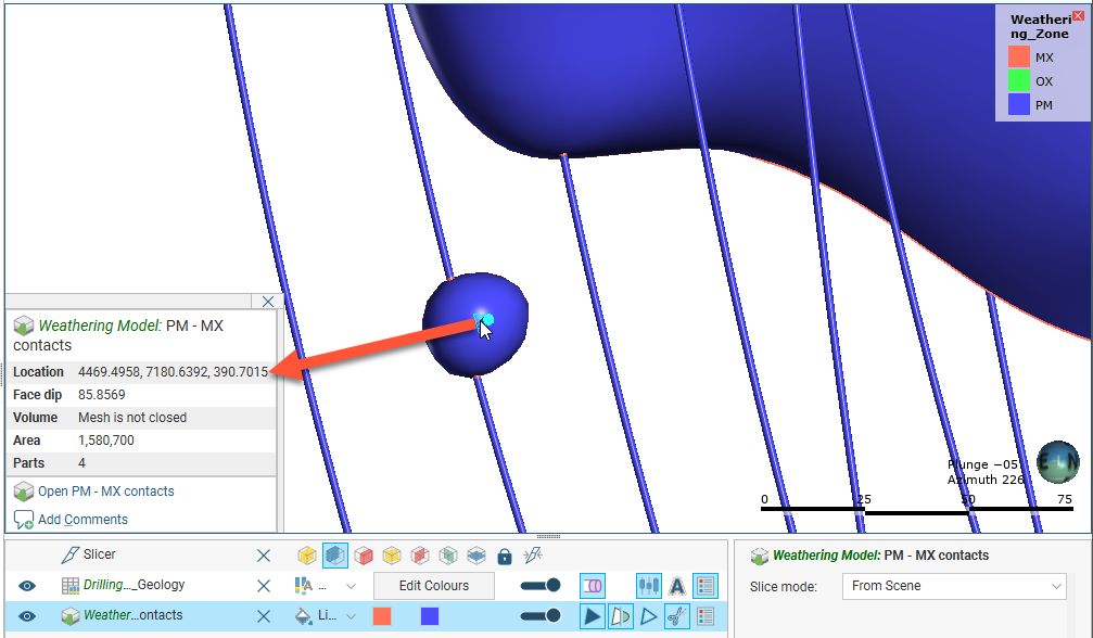 If you require an exact position, click on the object. Leapfrog Works will compute the exact position of the point highlighted in the scene and display it in a pop-up window: