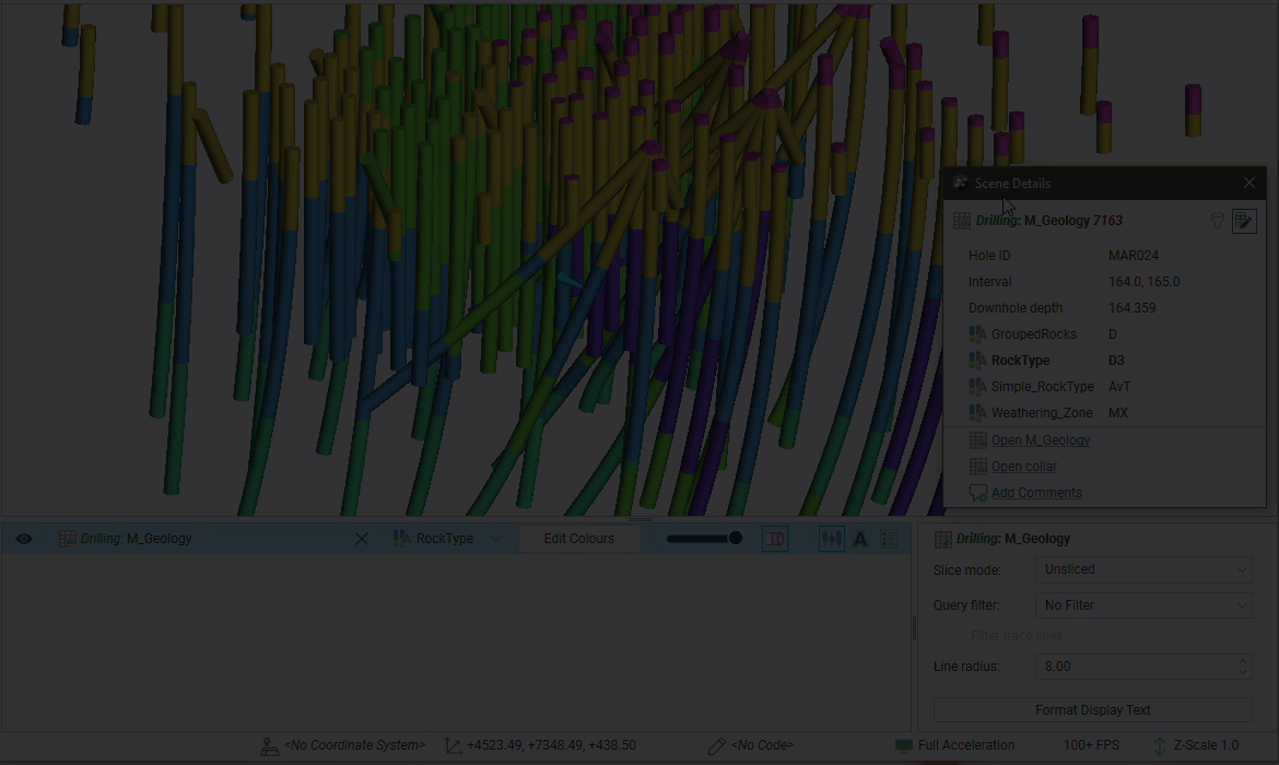 Clicking on an object in the scene displays a Scene Details panel that contains a summary of the data. For example, here drilling data is displayed in the scene and clicking on a segment displays information about the selected segment. For drilling data, this information includes the hole ID for the selected segment, location information for the interval, the Downhole depth at the selected location and the values for the different data columns in the table: