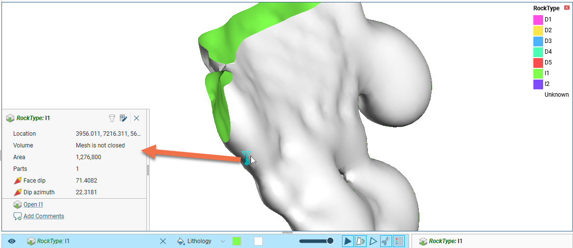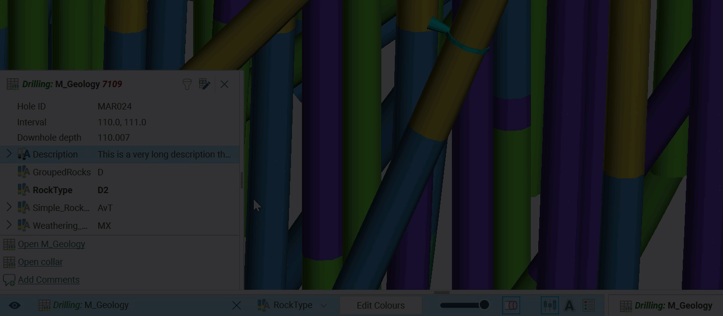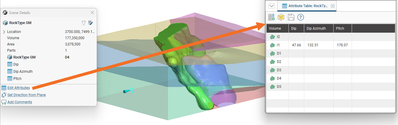 Some objects will also include options for working with the object by, for example, editing the object’s attributes or using the moving plane to set direction attributes. For example, here information is displayed for a geological model and there is a link to editing the model’s attributes: