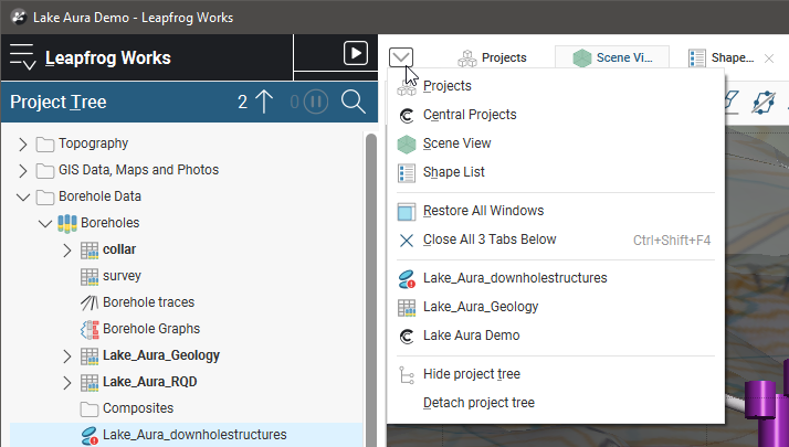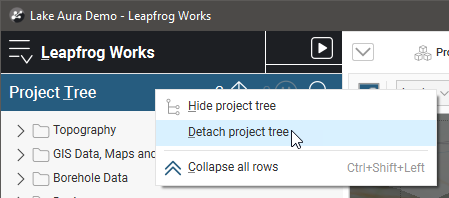 You can split the Leapfrog Works main window into separate parts to make better use of your screen space. In addition, some Leapfrog Works windows open in separate tabs that can be used either docked or detached. This topic describes how to change the main window to make the best use of your screen space. It is divided into: