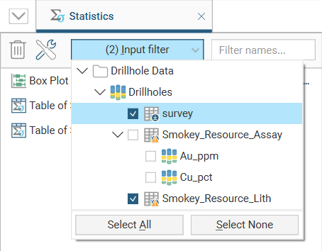 Leapfrog Works has a number of tools that help you to statistically analyse your data. This topic describes the different statistics visualisations available in Leapfrog Works. It also describes the Statistics object, which collates and organises charts and tables you have defined for data in the project.