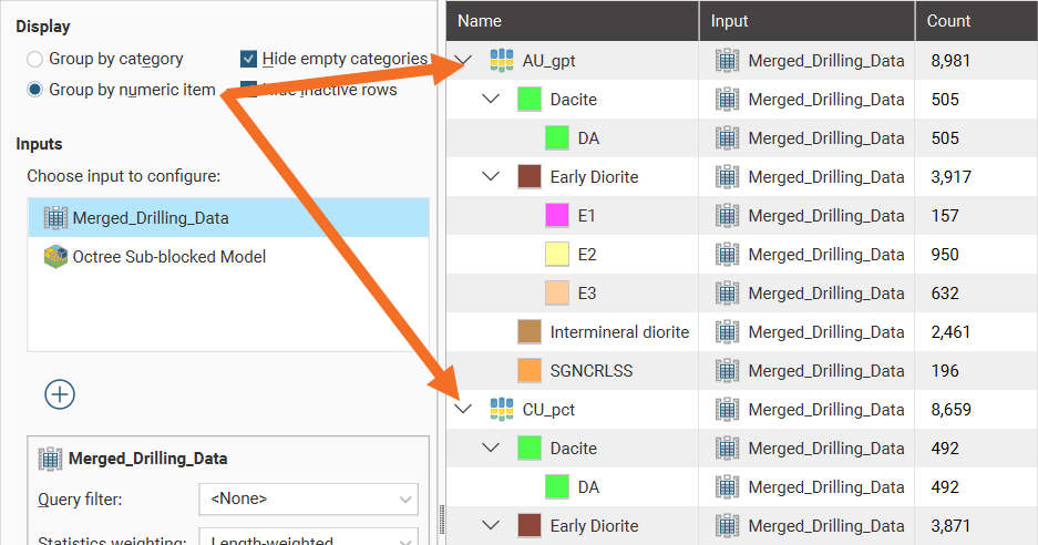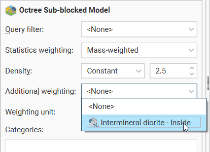 For a block model, the options are Un-weighted, Volume-weighted and Mass-weighted. When Mass-weighted is selected, you can also specify the Density as a constant number or by referencing a data column that contains density information. There is also an Additional weighting column which allows the selection of another numeric column to use for scaling. This is especially useful for selecting a stored proportion as illustrated here: