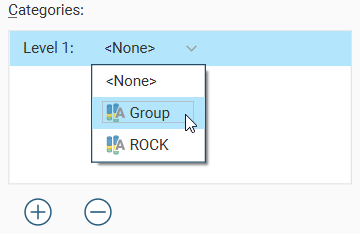 Click the Add button below the Categories list to select from the category columns available in the input table. An entry will be added to the Categories list. Open the dropdown list to select from the available category columns: