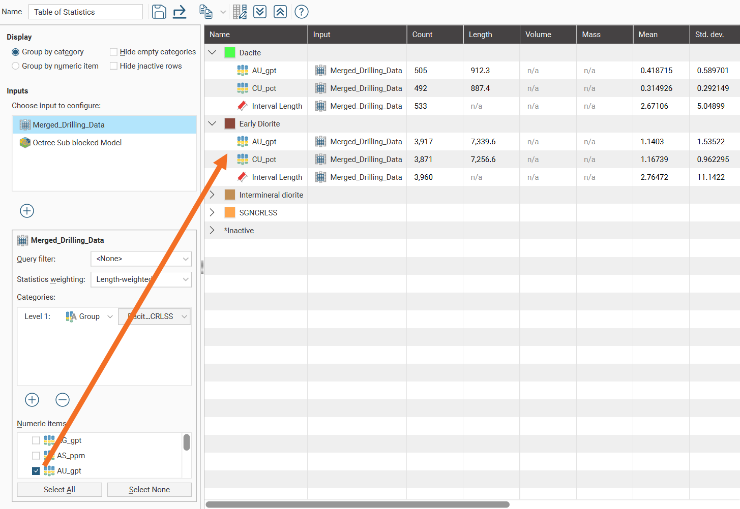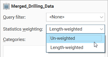 The Statistics weighting dropdown list will contain different options depending on the object being inspected. For this merged table example, the options are Un-weighted and Length-weighted.