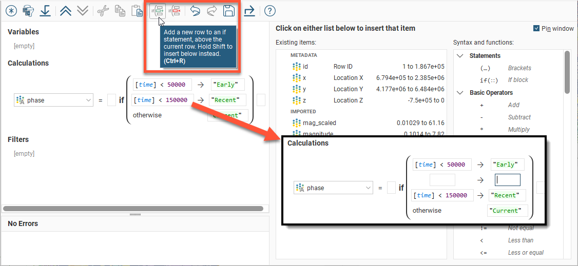 Items in the Existing items list or in the Syntax and functions list can be selected and added to the Calculations pane. While a calculation or filter is incomplete, the Error pane will identify what is needed to make the calculation valid.