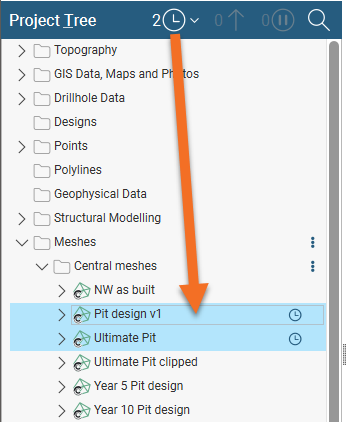 Whether you wish to import data from a revision or from a Central project’s files, use the Shift and Ctrl keys to select as many objects as required. Click Import to import the objects, which will be saved into the project tree. Objects imported from Central are displayed using a different icon. For example, here the meshes in the Central meshes folder are marked with the Central logo (