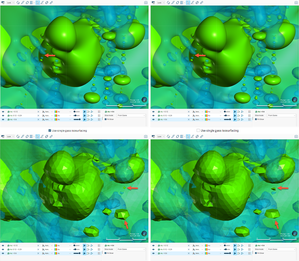 Here a scene has been rendered with both 1m (top) and 10m (bottom) surface resolution, with Use single pass isosurfacing ticked and unticked. The arrows are used to point out subtle differences due to this setting.