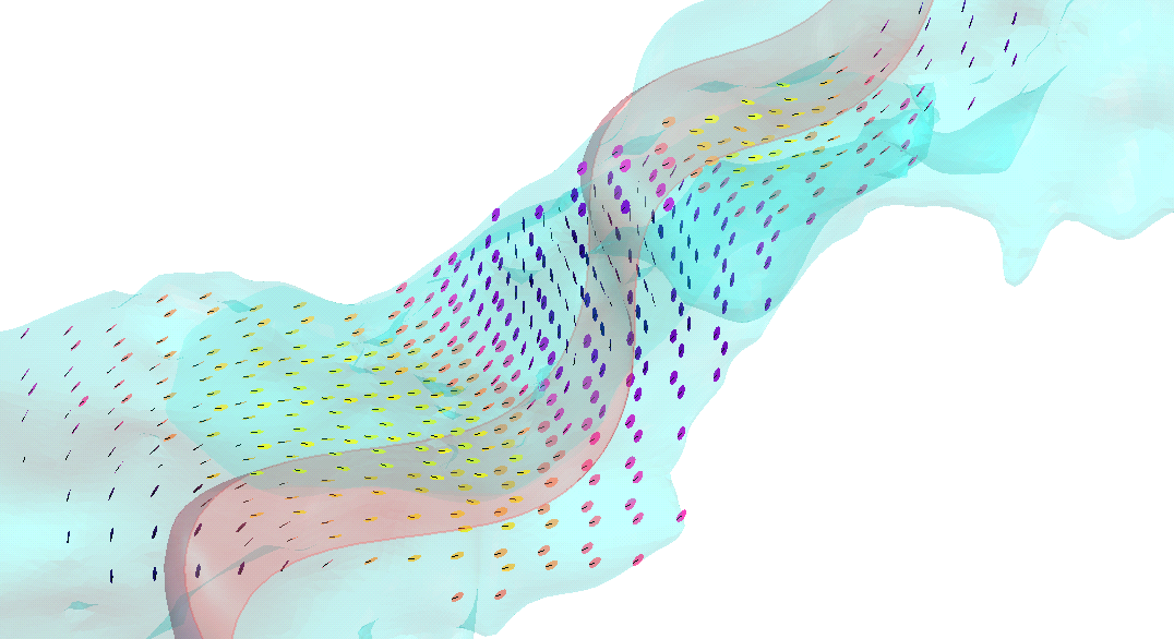 Variable orientation provides a similar control over the changing direction of anisotropy for the purposes of improving local value estimates, orienting the search space and variogram according to local characteristics. Variable orientation is visualised using lines or, as in this illustration, flat disks with a line indicating the orientation of the maximum axis direction for each search space local to each centroid. Here the disks have also been coloured reflecting the Dip direction.