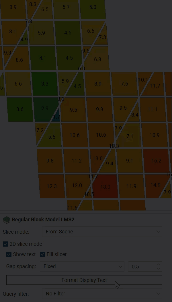The Show text option provides the choice between seeing a value on screen for each block intersecting the slicer, or not. The default value is the value for the column selected to colour the block model.
