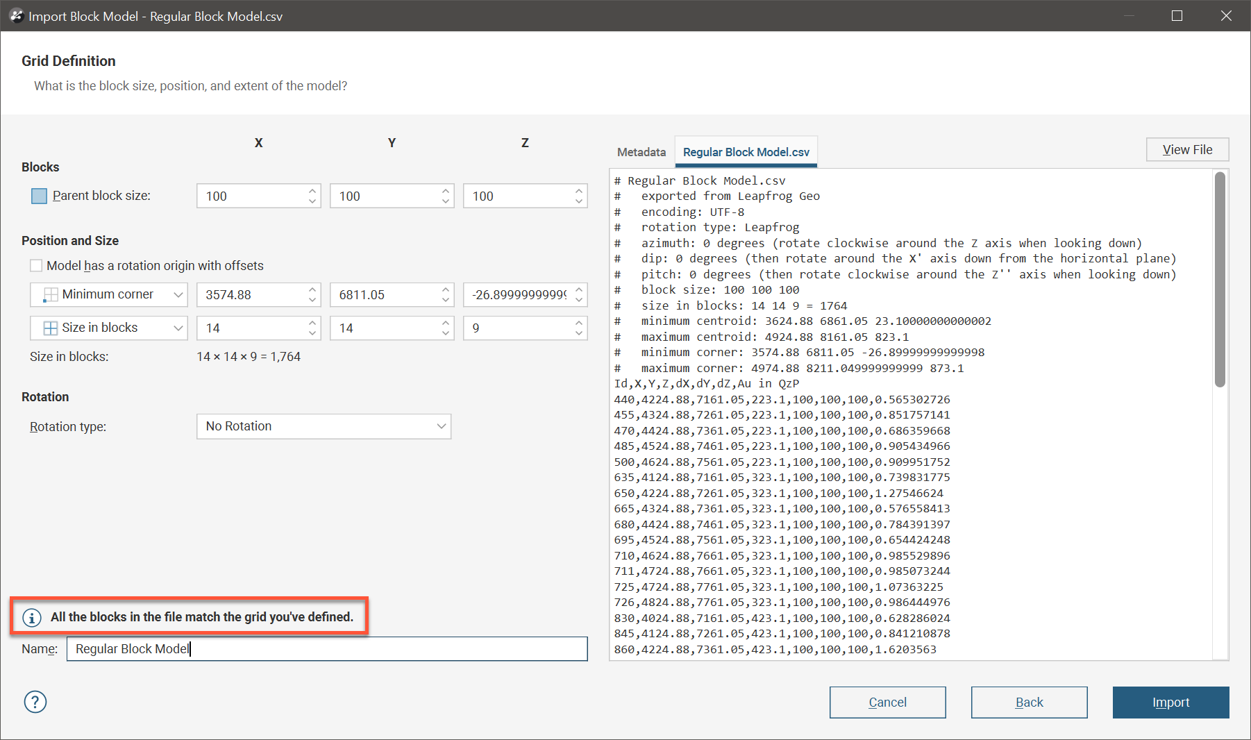 If you are opening a block model *.csv file created by Leapfrog, the Grid Definition fields will be automatically populated.