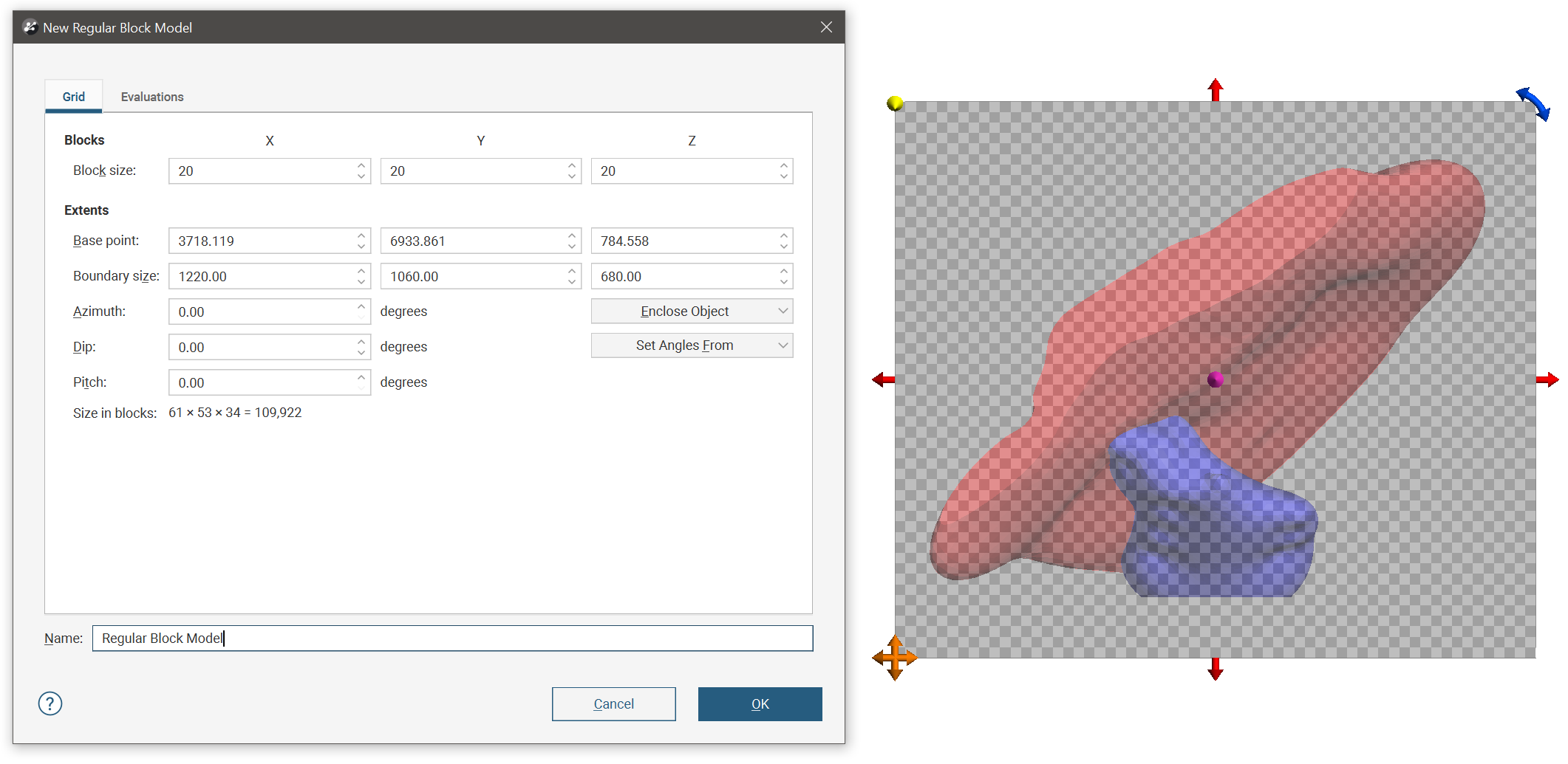 The New Regular Block Model window will appear, together with a set of controls that will help you set the size, location and orientation of the model in the scene: