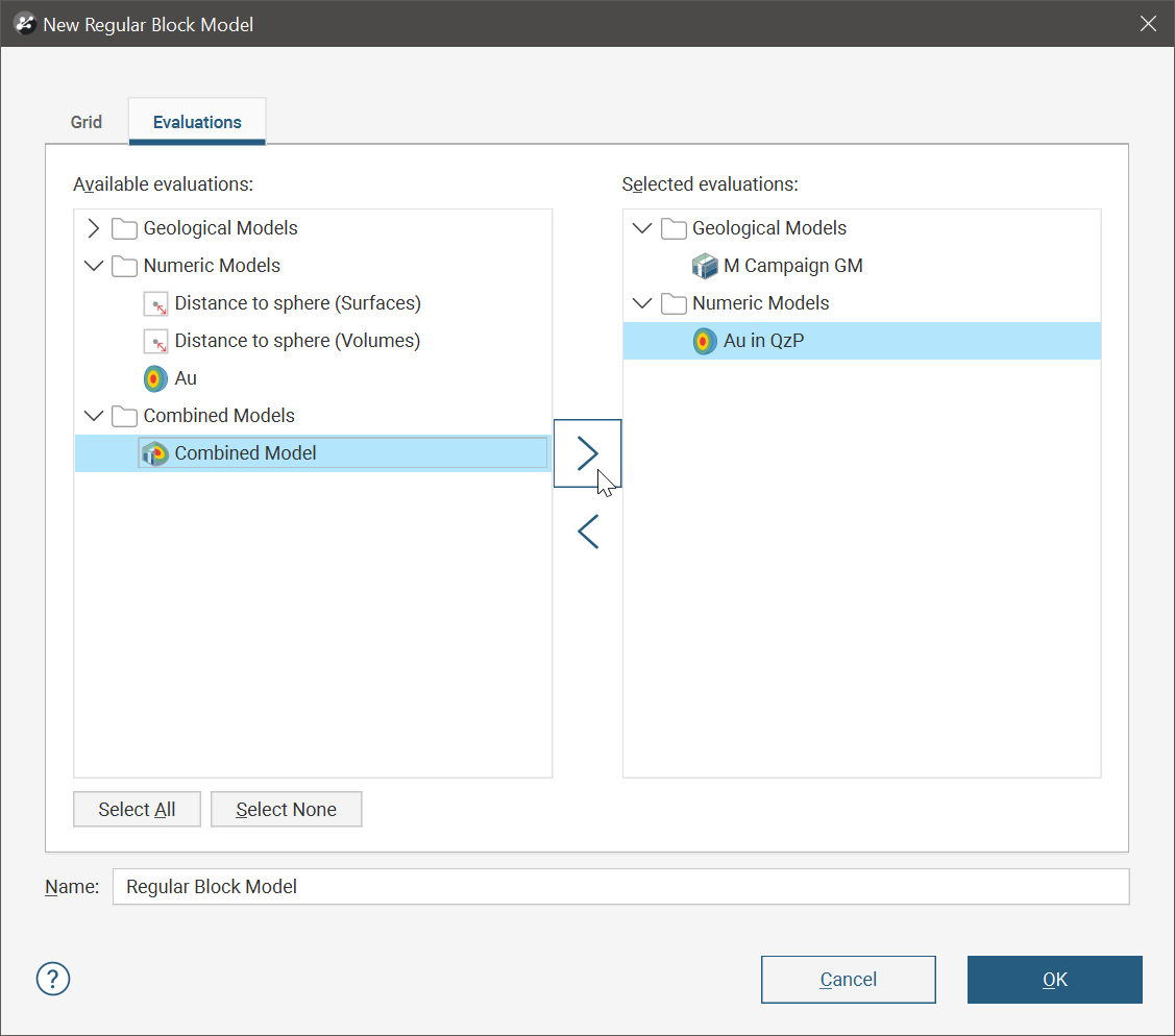 You can also evaluate the block model against geological models, interpolants and distance functions in the project. To do this, click on the Evaluations tab. All objects available in the project will be displayed. Move the models you wish to use into the Selected evaluations list.