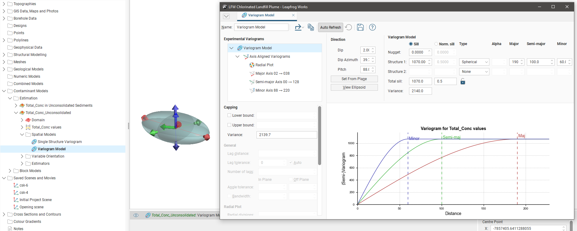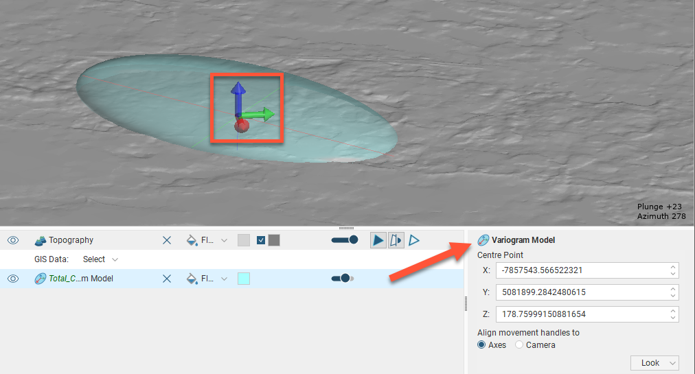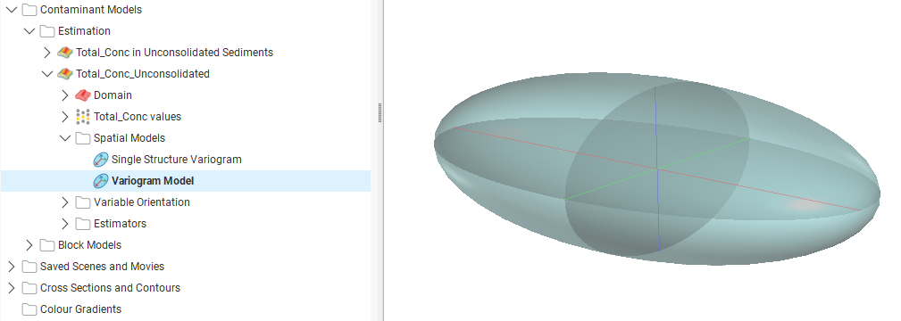 You can also open the variogram model and switch back to the scene or undock the variogram tab and move it away to see the scene, and because the variogram model is open for editing, the ellipsoid widget appears in the scene with drag handles.