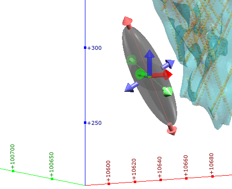 An ellipsoid may appear in the scene in a display mode or an editing mode. In display mode, the ellipsoid has no visible handles, and in editing mode the widget has drag handles on the outer edges of the ellipsoid to change its shape and orientation. For instance, you can drag the variogram model into the scene from the project tree, and it will appear in the scene in display mode.