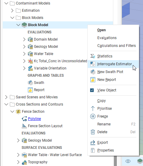 It is good practise to check the estimates produced for blocks, inspecting the data used to create the estimate. The block estimate interrogator exposes the data used to produce an estimate. Right-click on a block model in the project tree and select Interrogate Estimator.