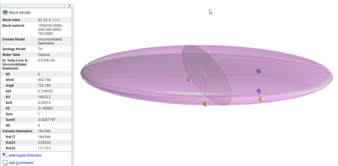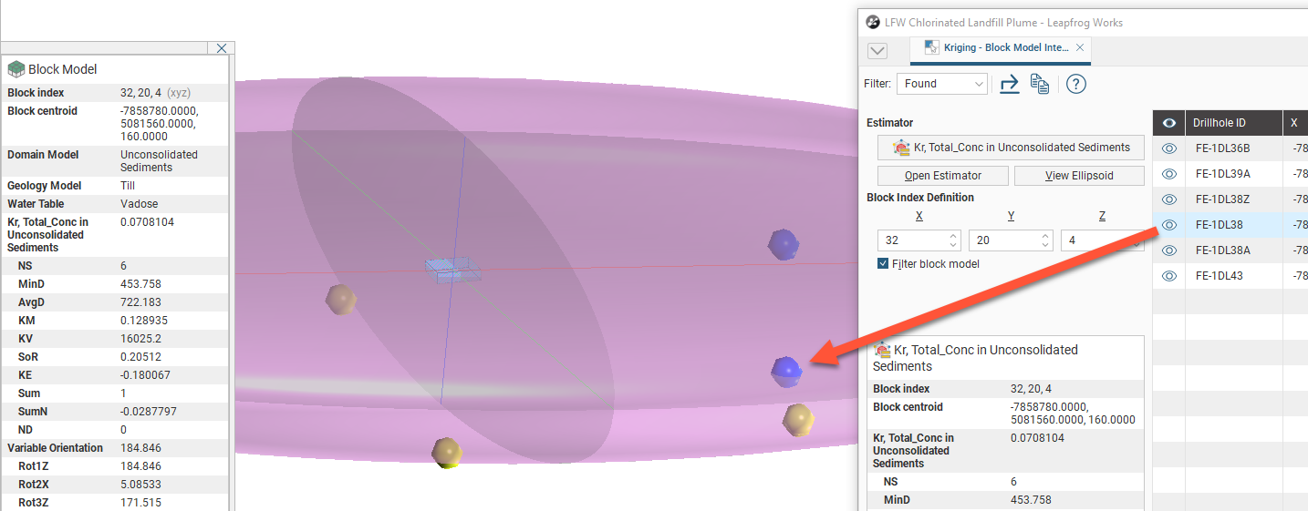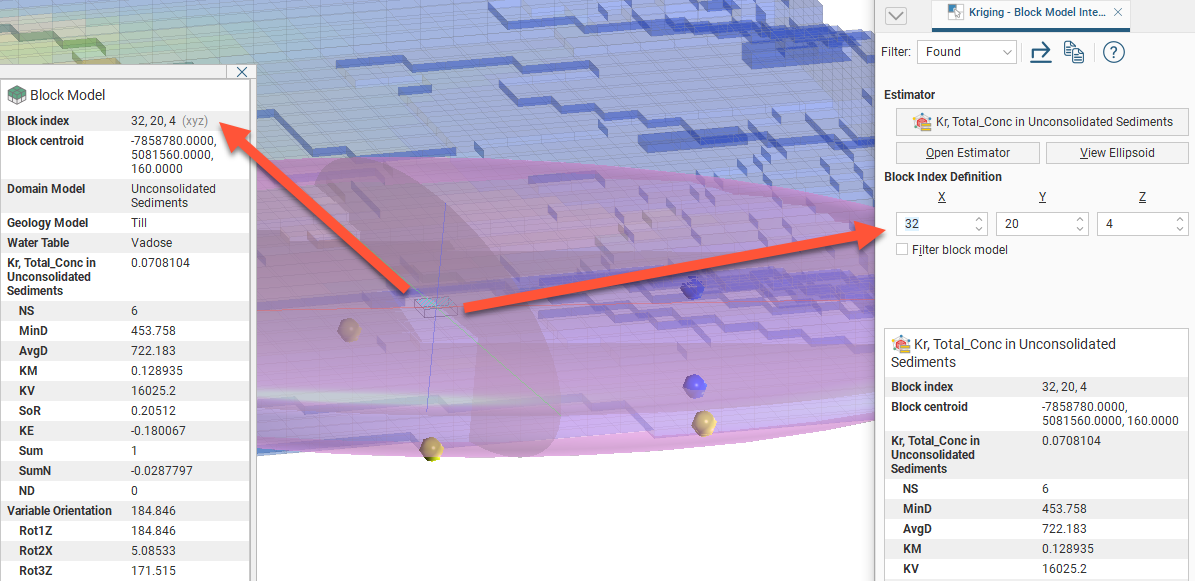 Enable Filter block model to see only the selected block in the scene, which will reduce the visual noise of all the other blocks. This will help you see the associated data points and the search ellipsoid in relation to the selected block: