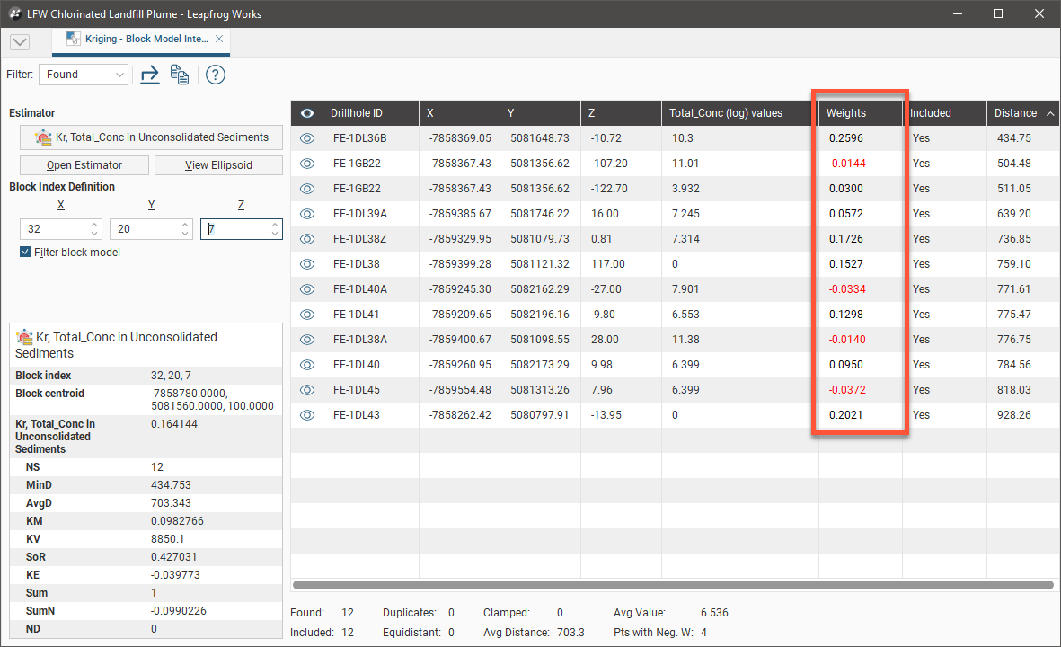 You can change the Estimator to select between the inverse distance and Kriging estimators evaluated on the block model. Other estimators are not supported by the block model interrogation feature.