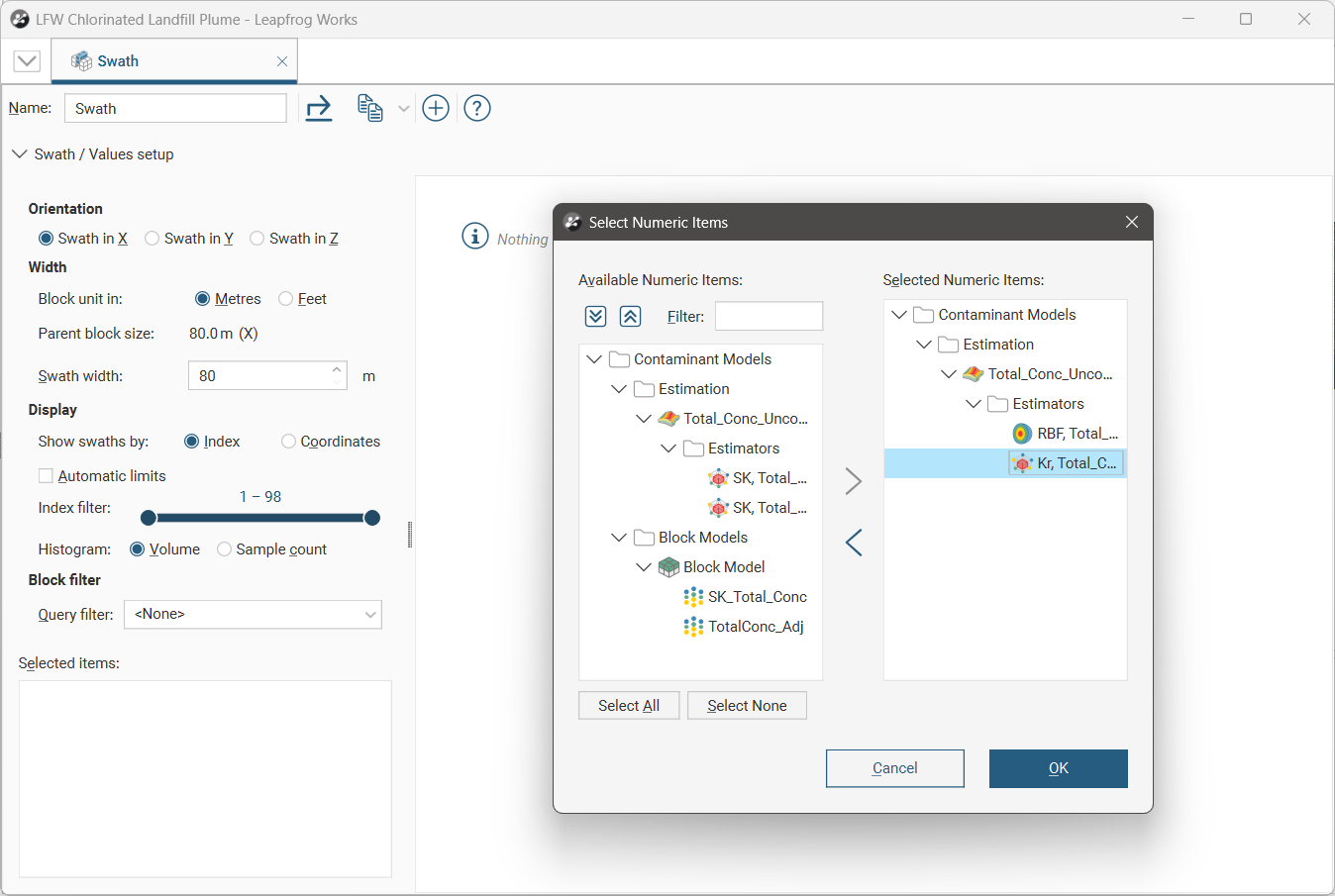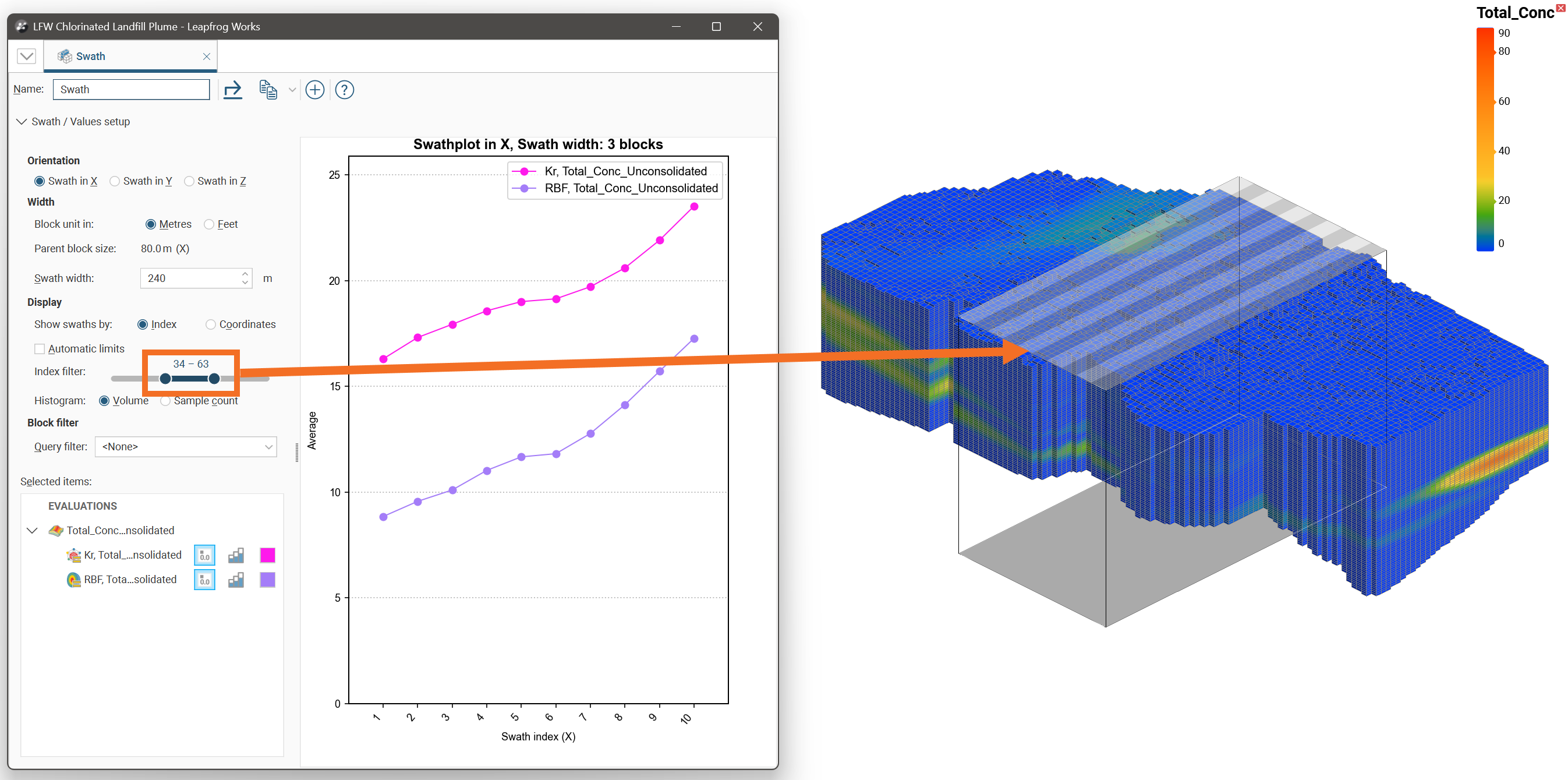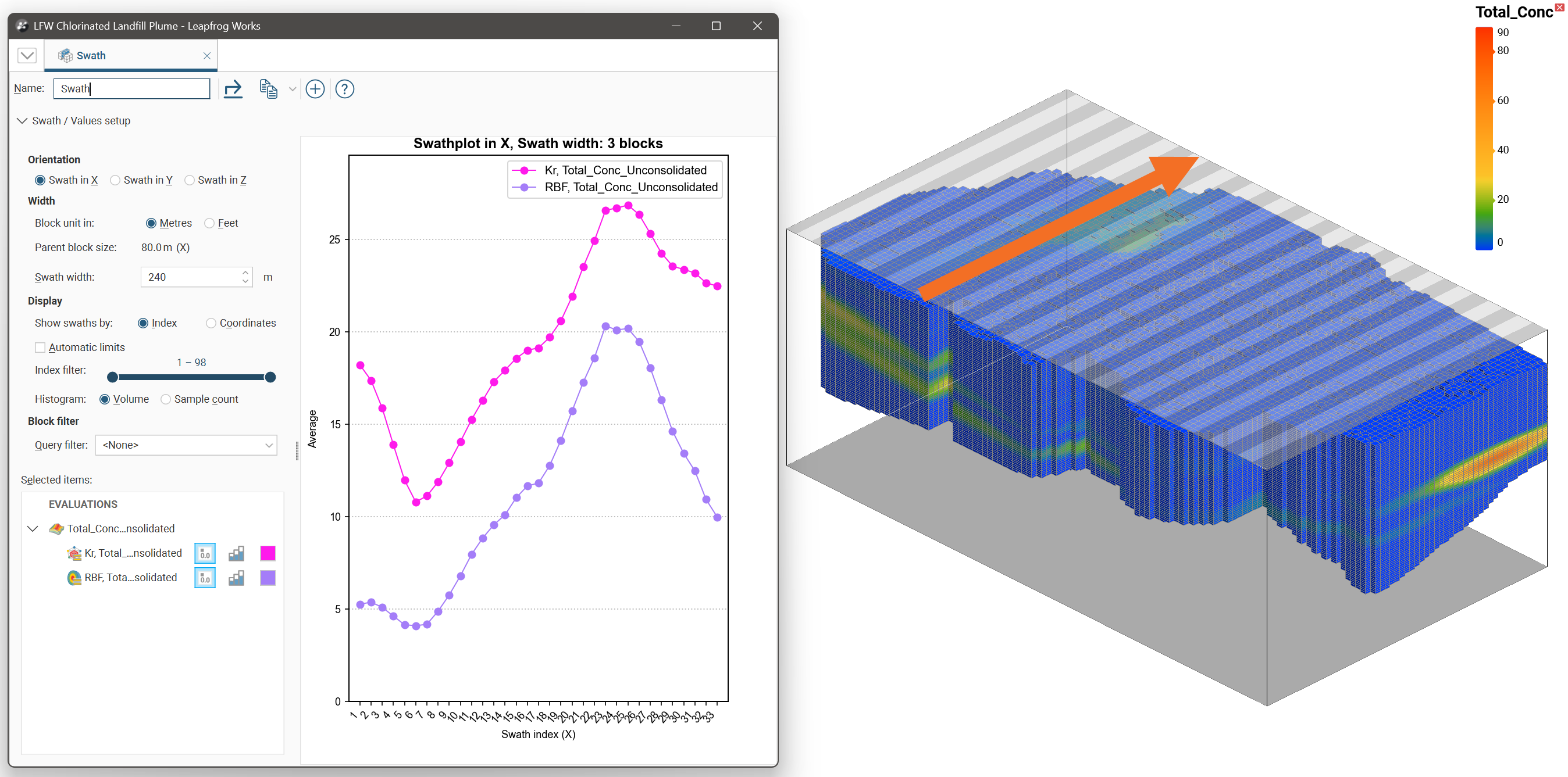 Leapfrog Works provides tools to validate the contaminant estimation models and report the results. Block estimation interrogation is used to inspect the contaminant estimate results. Swath plots and reports add additional insights and provide the basis for visual assets for inclusion in reporting documents.