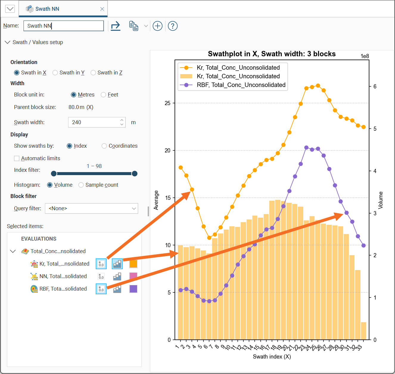 ) will reveal or hide a histogram showing the volume of blocks used in the swath calculation. The block volume may not be identical for all estimators.