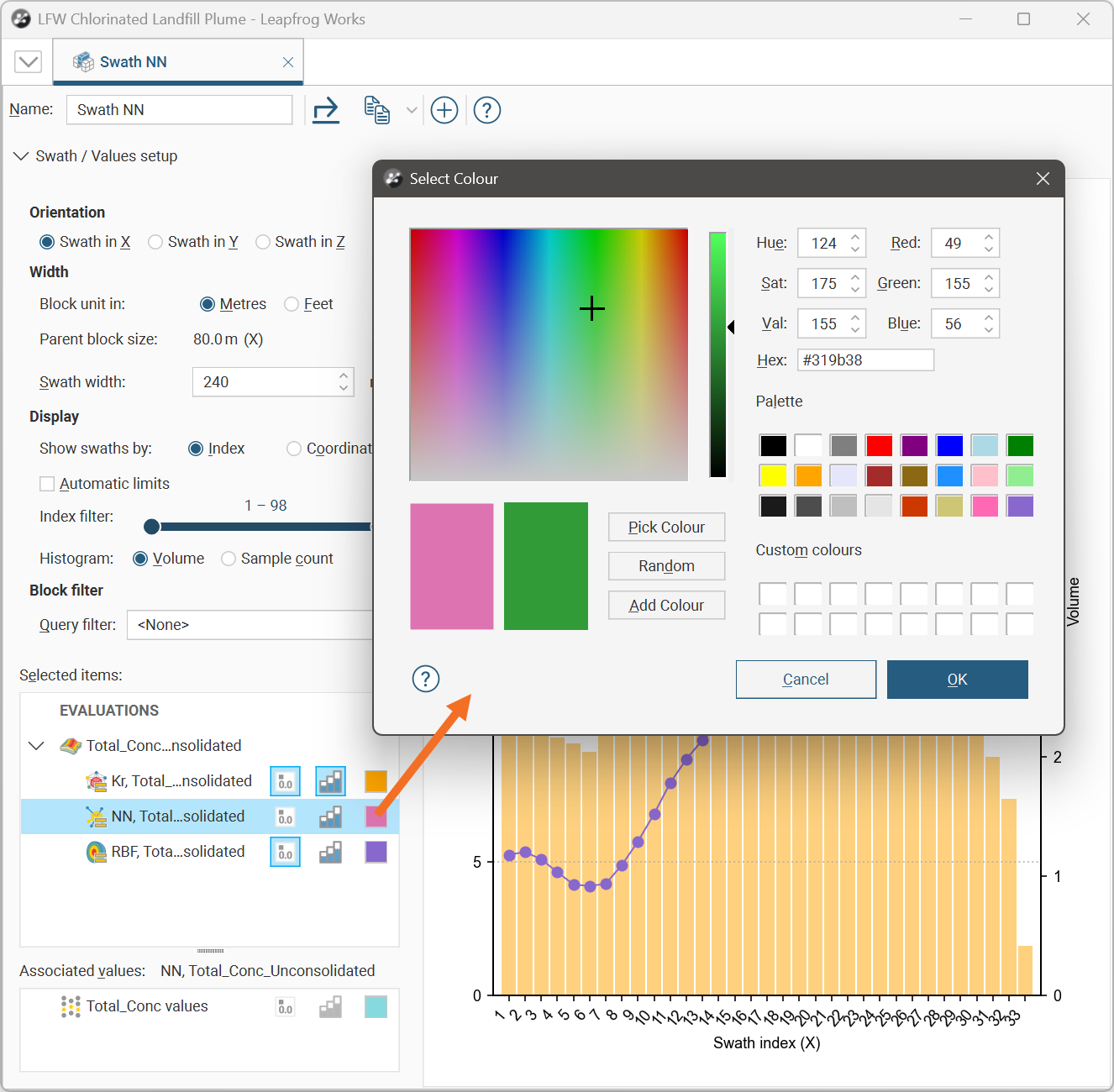 The colour for the line segment plots and histograms can be changed for each dataset by clicking the colour chip, and selecting a new colour from the colour picker: