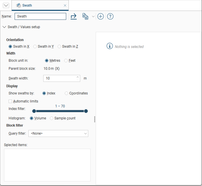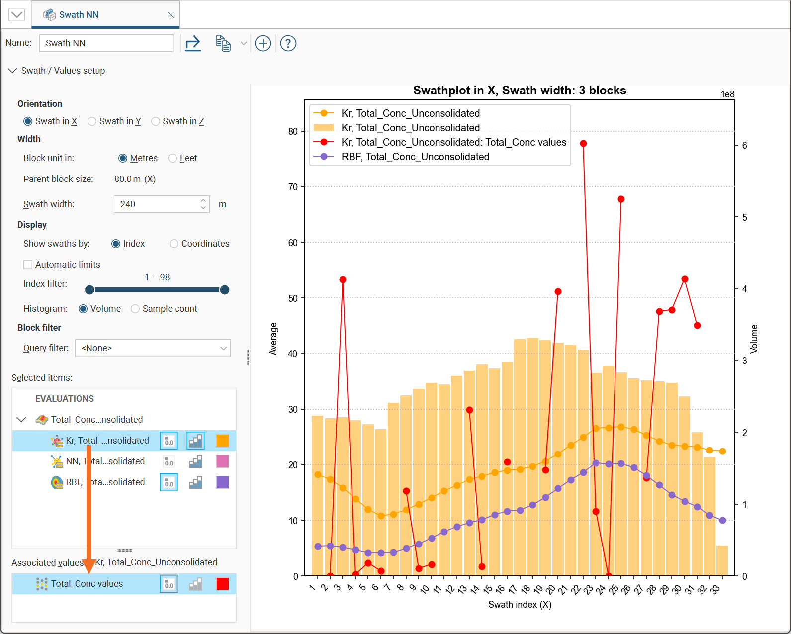 The swath plot is a one-dimensional graph in a specific direction of interest. A swath is a sectional slice through the block model with a specified thickness. The swath plot shows the average values for the blocks in the swath. You can also view the volume and the averaged sample values in the swath.