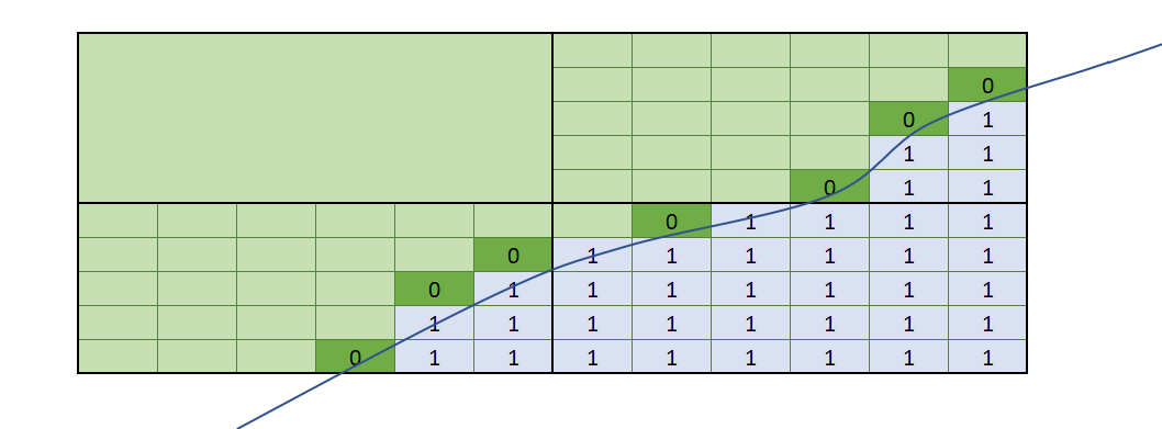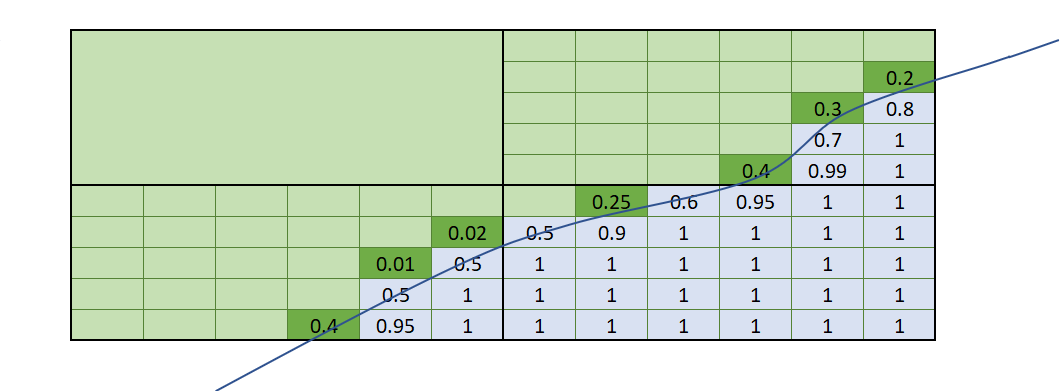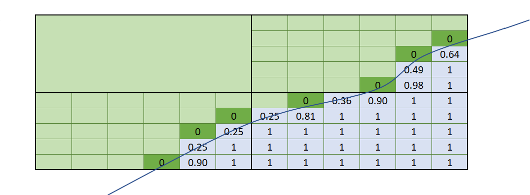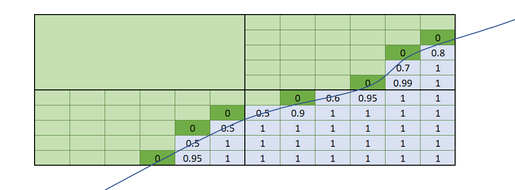 This matrix shows the results of the combinations of the volume filter’s Entire block and Proportion of block options against Additional weighting being selected as none or the volume of interest. The line crossing through the boxes shows part of a closed mesh volume. Blocks shaded grey have their block centroids within the mesh volume. Note that even though the same volume of interest is used in all cases, when both Proportion of block and Additional weighting are applied at the same time, the values in the blocks are undervalued because the proportion has been applied twice.