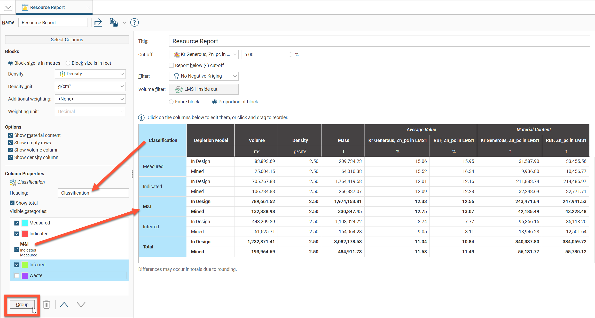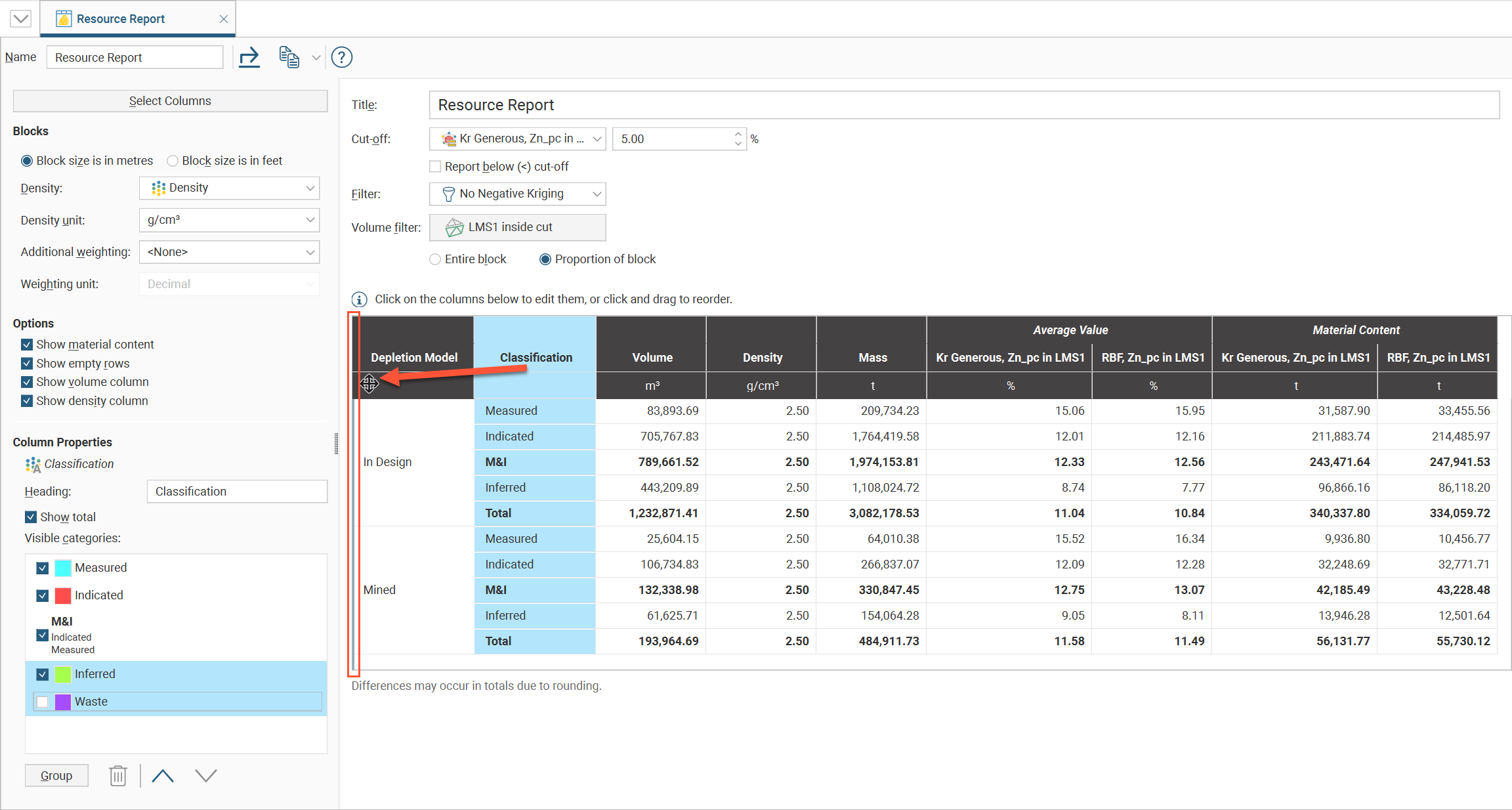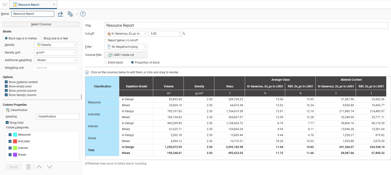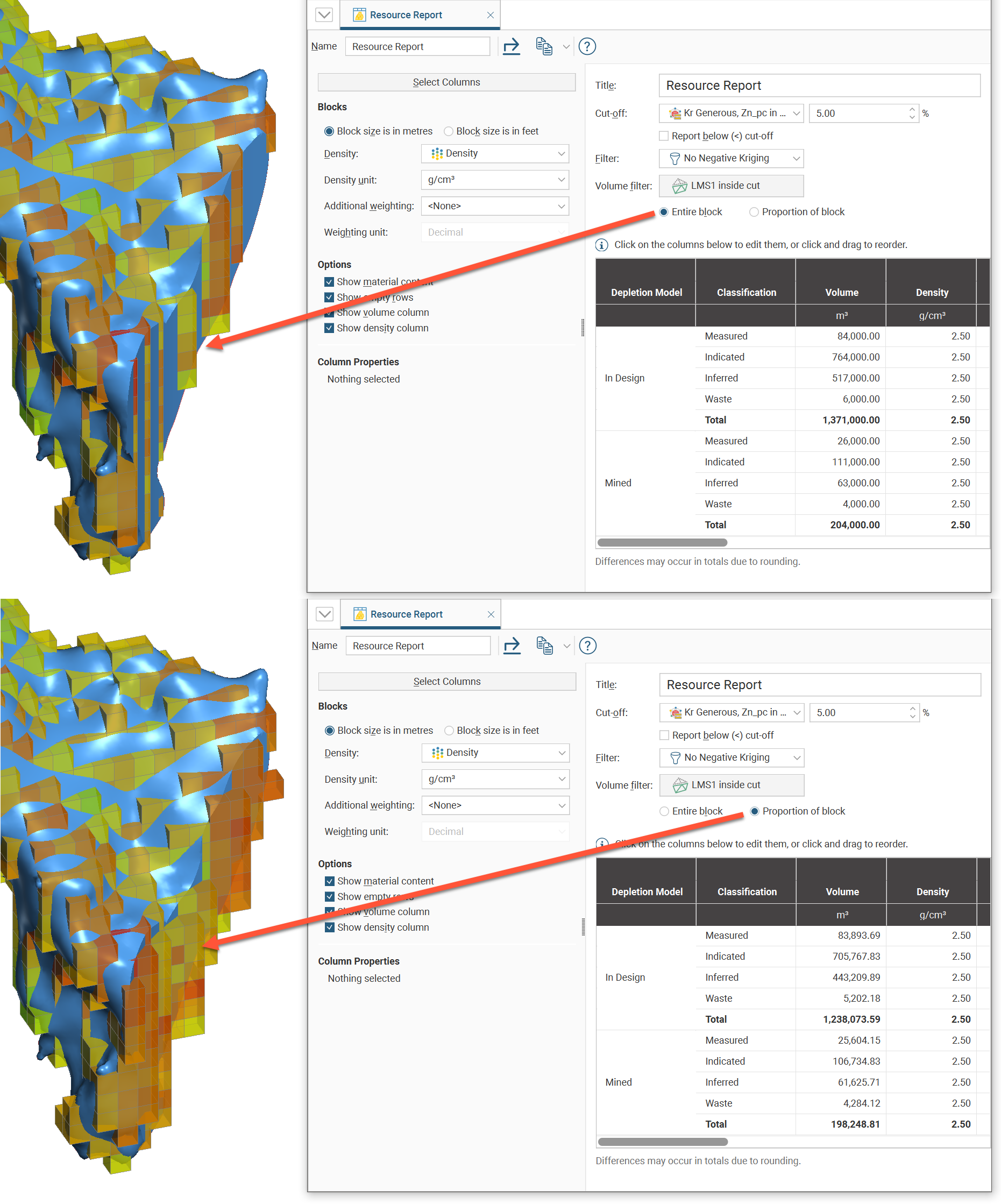 - If Proportion of block is selected, only the proportion of a block that is within the selected volume will contribute to the report.