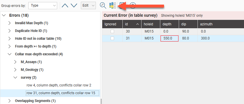 Errors are automatically grouped by Type, but if there are many errors, you may find it useful to view them grouped by Table or by the Hole: