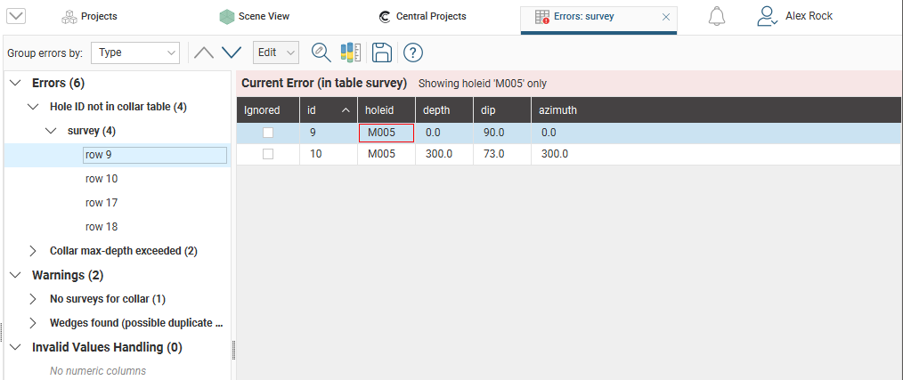 There are many possible sources of error in the data itself and you may be able to correct the errors directly in the Errors window. With drilling data, however, the message given in the Errors may actually point to an error elsewhere in the dataset, in which case you will need to open the other table from the project tree and edit it directly.