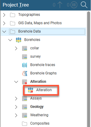 Leapfrog Works automatically identifies and flags common data errors when data tables are imported. In the project tree, there are three ways Leapfrog Works marks tables that contain conflicts or errors: