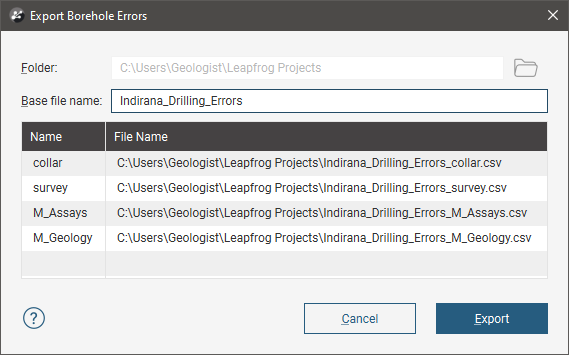 To export all errors in the drilling dataset, right-click on the drilling dataset and select Export > Export Errors. The Export Borehole Errors window will appear:
