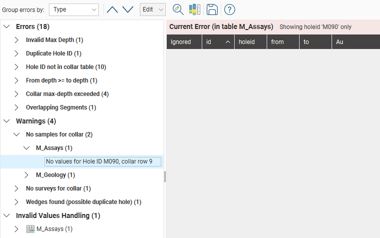Interval tables will have No values for Hole ID warnings when there are no values in the interval table that correspond to a collar defined in the collar table. In this example, a hole called M090 has been defined in the collar table, but there is no data for it in the M_Assays table.