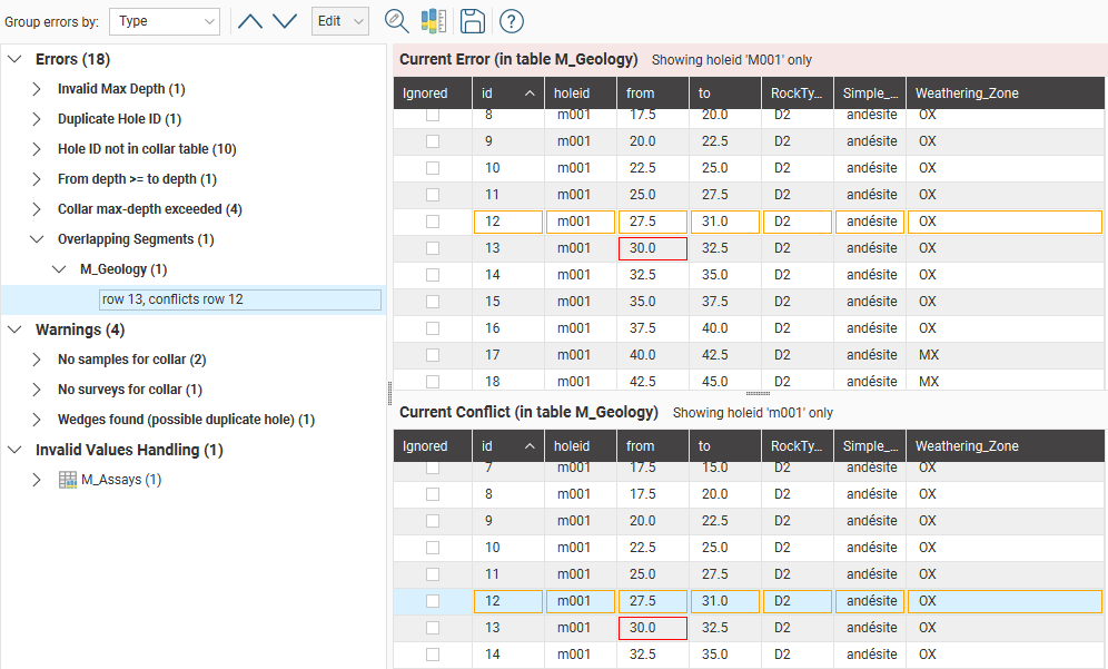 Interval tables will have Overlapping Segments errors when intervals are in the same place for the same hole or when two holes are in the same place. Here, row 12 overlaps row 13 and the error can be corrected in the Errors window by entering the correct to value for row 12: