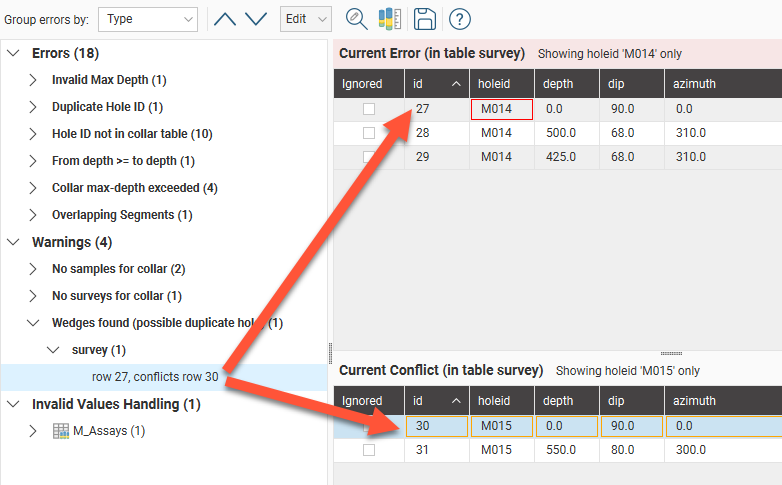 Collar tables will have Duplicate Hole ID errors when collars have been assigned the same ID. Here, rows 4 and 5 have the same ID but are clearly different holes:
