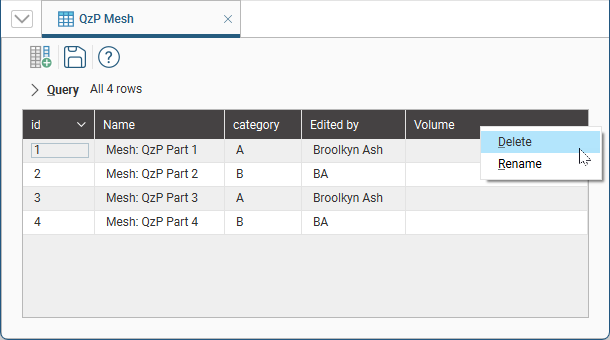 For mesh and volume attribute tables where the data columns are not shown in the project tree, you can delete or rename columns by first opening the table. You can then delete or rename a column by clicking on its header: