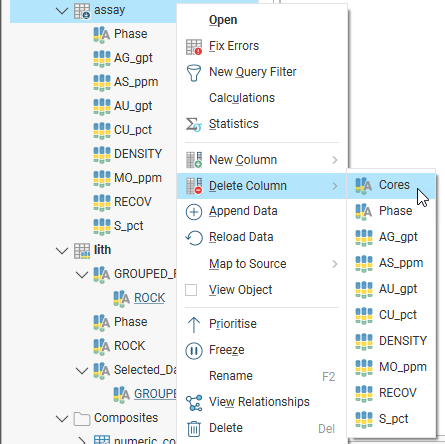 For column types that are displayed in the project tree, you can delete them by right-clicking on them in the project tree and selecting Delete. You will be asked to confirm your choice, as any objects in that project that have been created from that data column will also be deleted.