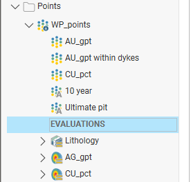 For most tables in a Leapfrog Works, you can view what columns it contains by expanding the table in the project tree. Here a points table contains three numeric data columns (