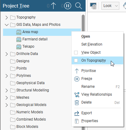 Images imported into the GIS Data, Maps and Photos folder can be draped on the topography. To do this, right-click on an image in the project tree and tick the On Topography box: