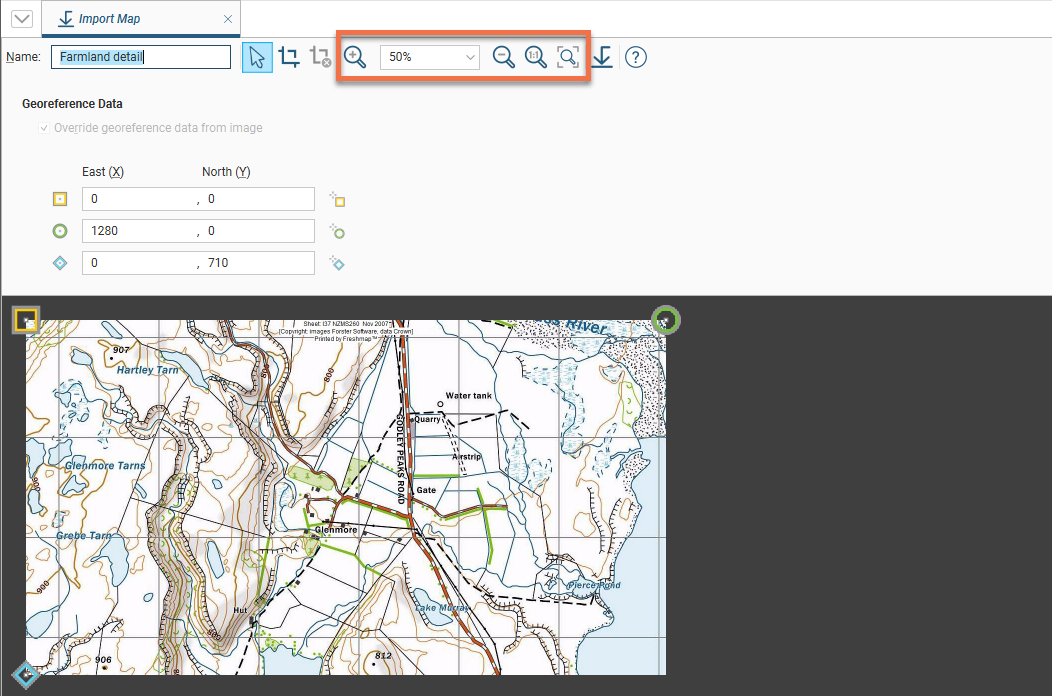 ) are used to set the georeference data for imported images. You can see these markers when you double-click on an imported image, which opens an image tab where you can edit the image’s georeference data. In this example, the georeference data is greyed out because the image contains that data:
