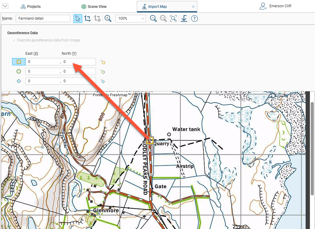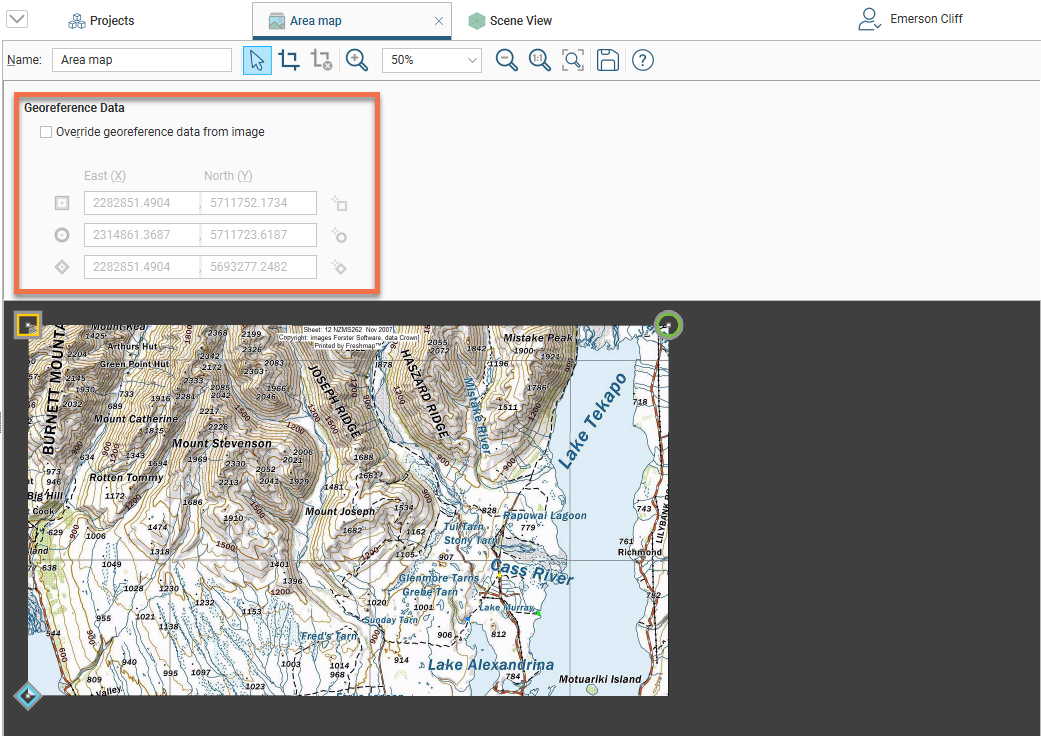 In most cases where images containing georeference data are imported into a project, you do not need to make any changes to this data. If, though, an image appears to be distorted when displayed in the scene, you may need to edit the georeference data. To do this, tick the box Override georeference data from image and you will be able to edit the three markers, as described below.