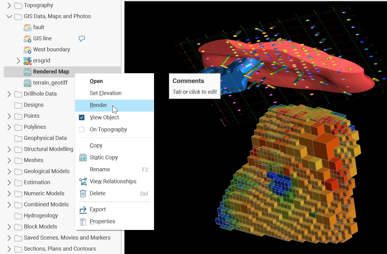 To obtain an image that can be used in other applications, right-click on the rendered map in the project tree and select Export to save it as a GeoTIFF file.