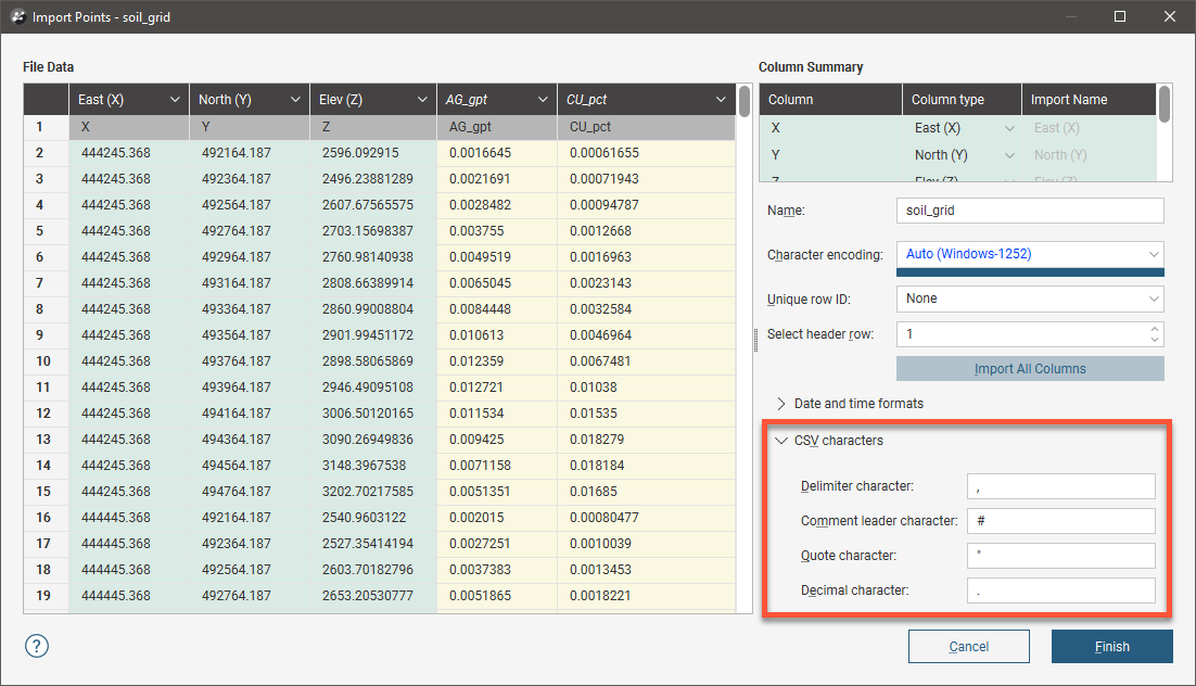 For this file, columns X, Y and Z in the file have been mapped in Leapfrog Works to columns East (X), North (Y) and Elev (Z). These are shown in green.