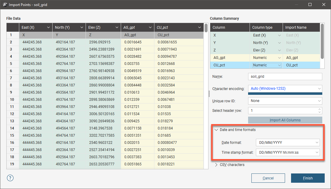 If the data contains date and time information and the date and time format is not detected, click on Date and Time Formats to reveal more information: