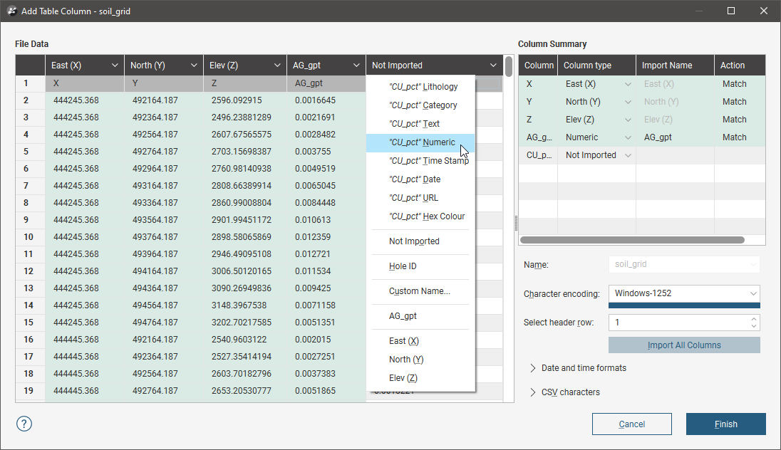 Importing a column is similar to importing tables themselves. Leapfrog Works will display the data in the file in the Add Table Column window and you can select how you wish to import any additional columns. Here, we will import the CU_pct column as numeric data: