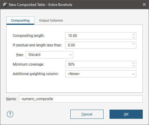 See Compositing in the Entire Borehole above for an explanation of the Length, Min. coverage, Res. length, Res. handling and Additional weighting column parameters.
