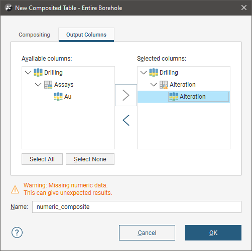 Compositing numeric data takes unevenly-spaced drilling data and turns it into regularly-spaced data, which is then interpolated. Compositing parameters can be applied to entire boreholes or only within a selected region of the borehole. For example, you may wish to composite Au values only within a specific lithology.